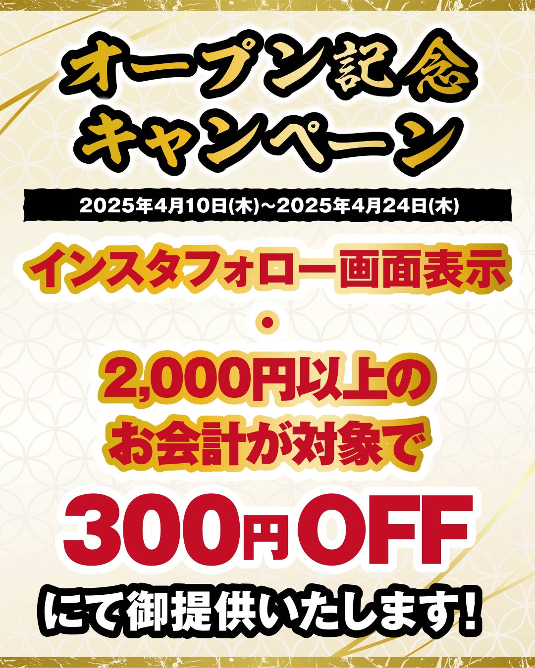 期間内「2000円以上のお会計」が対象で300円OFFでご提供致します。