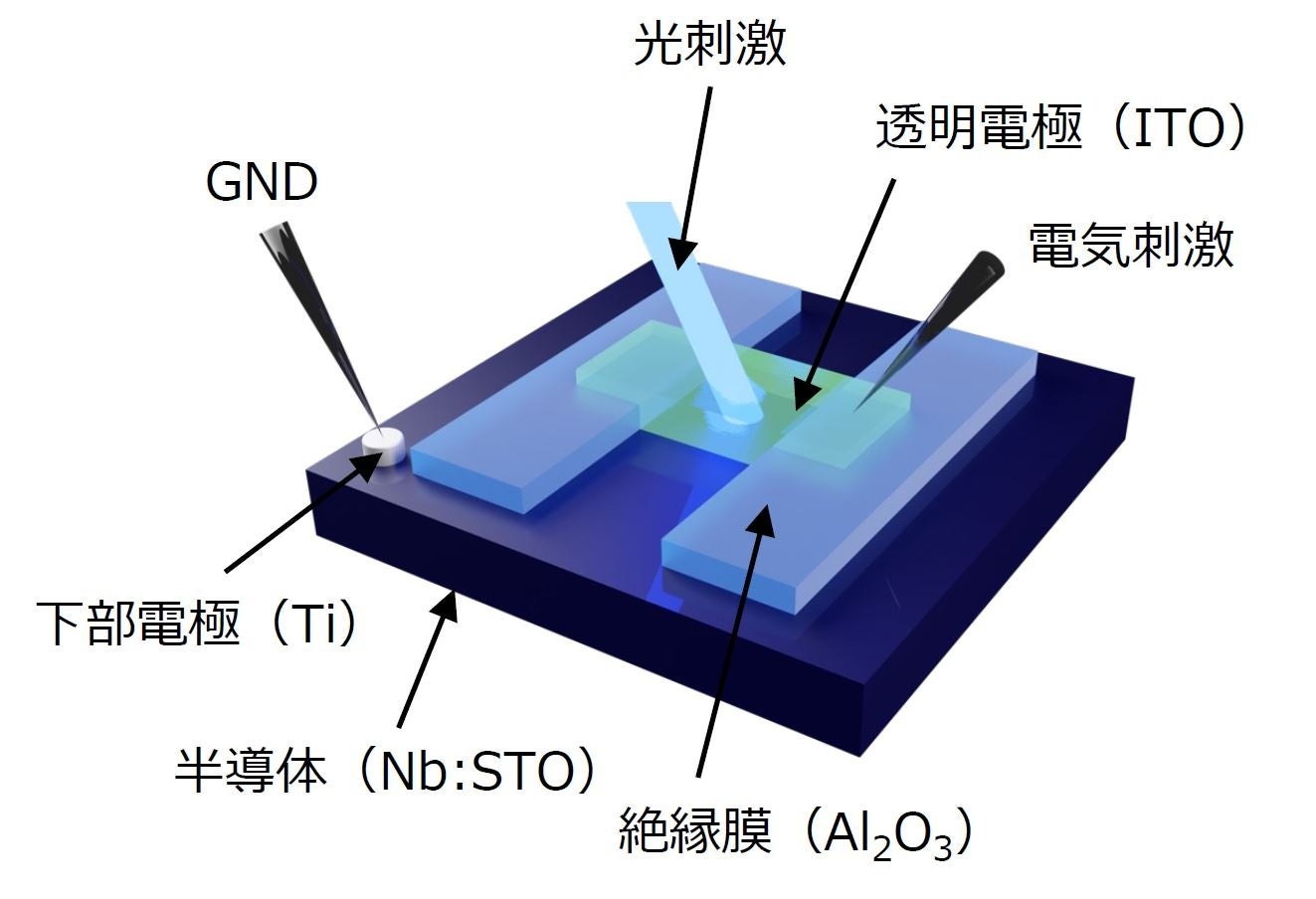 東京理科大学先進工学部物理工学科の木下健太郎教授、同大学大学院理学研究科応用物理学専攻の山﨑悠太郎氏(2023年度修士課程2年)の研究グループは、透明電極のSnドープIn2O3(ITO)、光刺激と電気刺激の両者に対して導電性が変化するNbドープSrTiO3(Nb:STO)から構成されるITO/Nb:STO接合の光メモリスタデバイスを作製し、光照射により誘起される電流の緩和時間を電気的に制御できることを実証しました(図1)。
