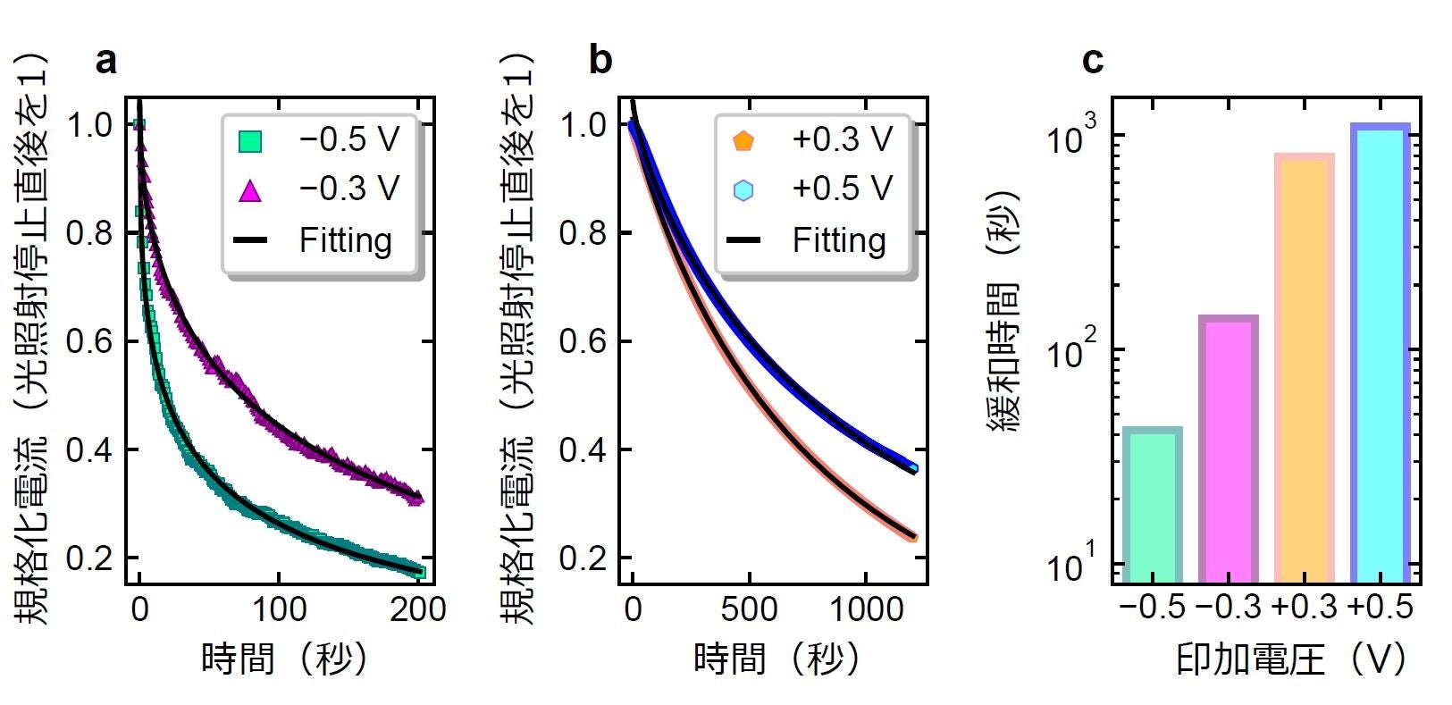図2. 光照射停止後の光誘起電流の過渡特性。(a) 負電圧印加時の光誘起電流緩和。(b) 正電圧印加時の光誘起電流緩和。(c) 光誘起電流の緩和時間を算出した結果。