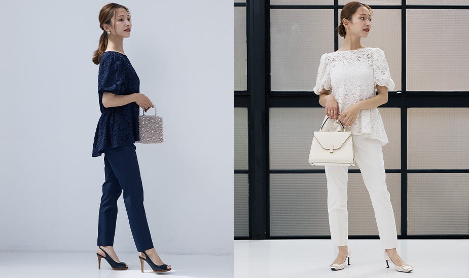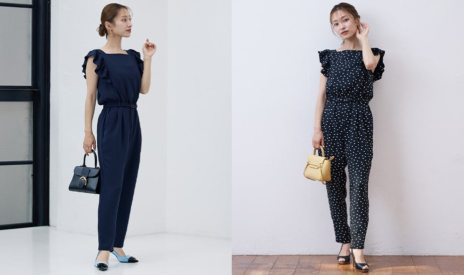 ナチュラルなストレッチ感と落ち感が上品さを引き立てるネイビーは、お仕事からお子さまのイベントまでマルチに。ドットはお休みの日に大活躍する1枚。