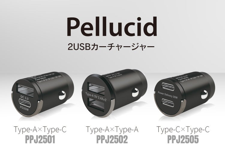 ペルシード 2USBカーチャージャー 品番:PPJ2501(Type-A×Type-C)、PPJ2502(Type-A×Type-A)、PPJ2505(Type-C×Type-C)