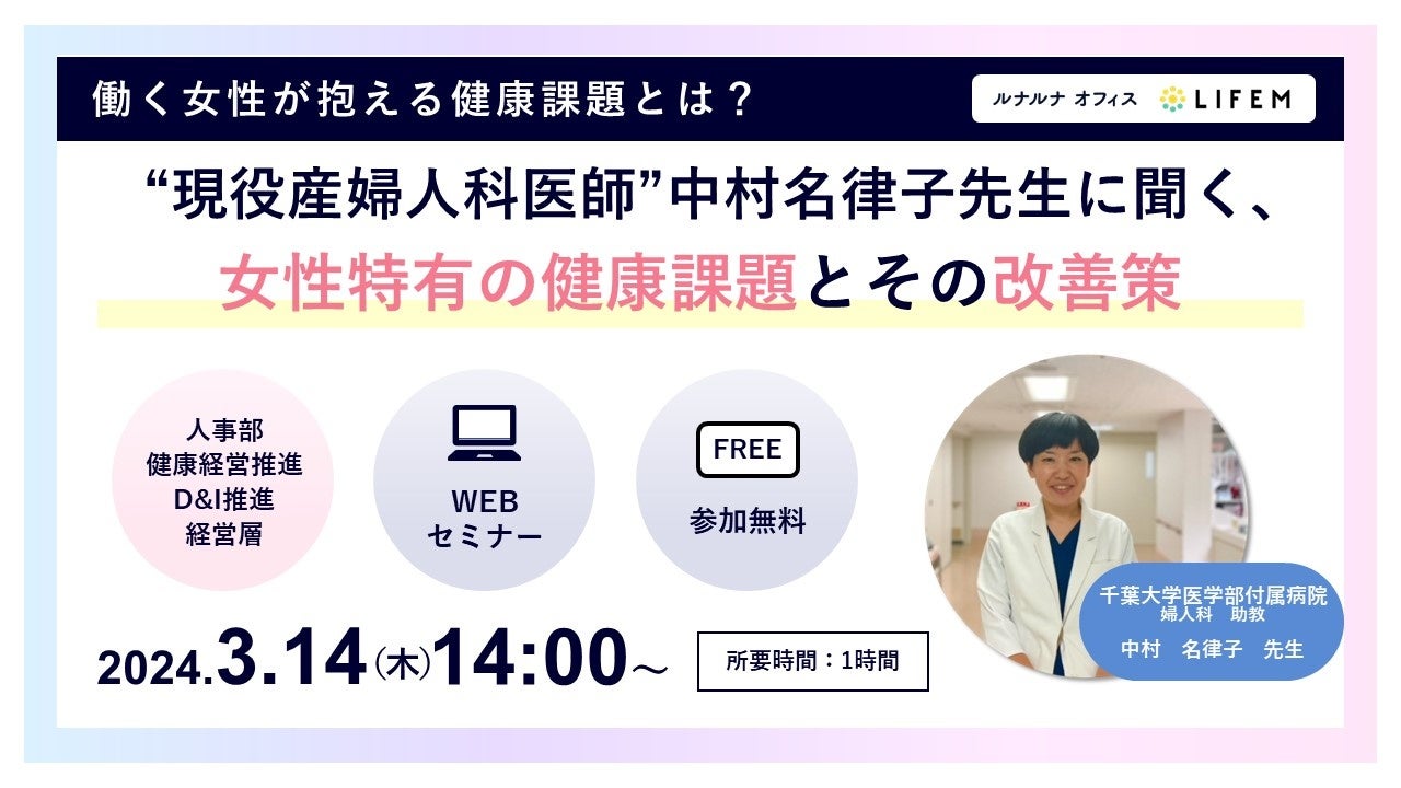 【3月14日14:00~】LIFEM 主催の企業向け無料オンラインセミナー「働く女性が抱える健康課題とは?“現役産婦人科医師”中村名律子先生に聞く、女性特有の健康課題とその改善策」を開催