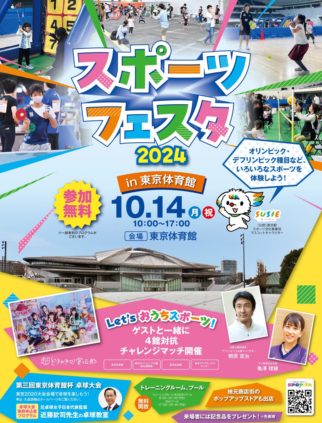 10月14日(月曜日・祝)「スポーツの日」に合わせ、子供から大人まで誰もが気軽にスポーツを楽しめるスポーツイベント「スポーツフェスタ2024 in東京体育館」を実施します。