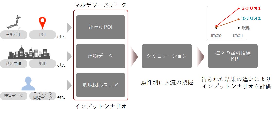 本共同研究では、GEOTRAが有する高度な人流シミュレーション技術と中央復建コンサルタンツの都市計画に係るコンサルティング技術を併せ、来訪者の興味・関心や飲食店データを含む「マルチソースデータ」を統合した、新規の都市評価モデルを開発します。