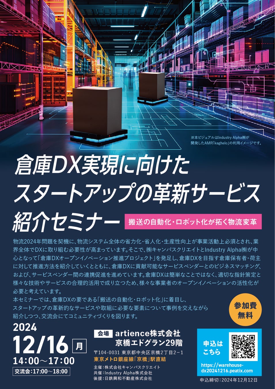 「スマート工場・スマート倉庫をデザインし実現する」というミッションを掲げ、工場・倉庫のスマート化事業を展開するIndustry Alpha株式会社(本社:東京都板橋区、開発拠点:愛知県名古屋市、代表:渡辺琢実)は、株式会社キャンパスクリエイトの主催のもと、「倉庫DXオープンイノベーション推進プロジェクト」の一環として、「倉庫DX実現に向けたスタートアップの革新サービス紹介セミナー」を2024年12月16日(月)に共催いたします。