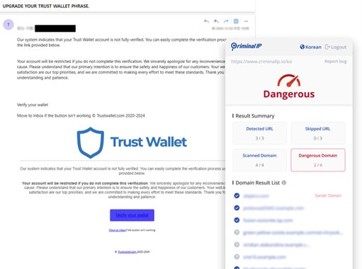 「Criminal IP悪性リンク検出器」は、暗号通貨ウォレットサービスである「Trust Wallet」のユーザーをターゲットにしたフィッシングメールを検出、予防したことがあります。当メールは、公式ページに偽装したリンクを通じてマルウェアのダウンロードを誘導したが、「Criminal IP悪性リンク検出器」がリアルタイムで検出して被害を予防しました。
