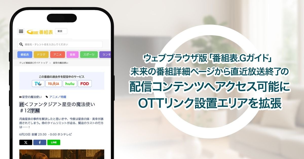株式会社IPG(本社:港区、代表取締役社長:岡本賢人、以下「IPG」)は、2025年6月19日(木)にウェブブラウザ版の電子番組表サービス「番組表.Gガイド」にて、配信コンテンツへ繋がるリンク(OTTリンク)の設置範囲を拡張し、「放送中」や「未来」の番組詳細ページから、直近放送終了した配信コンテンツへ直接アクセスできるようになりました。