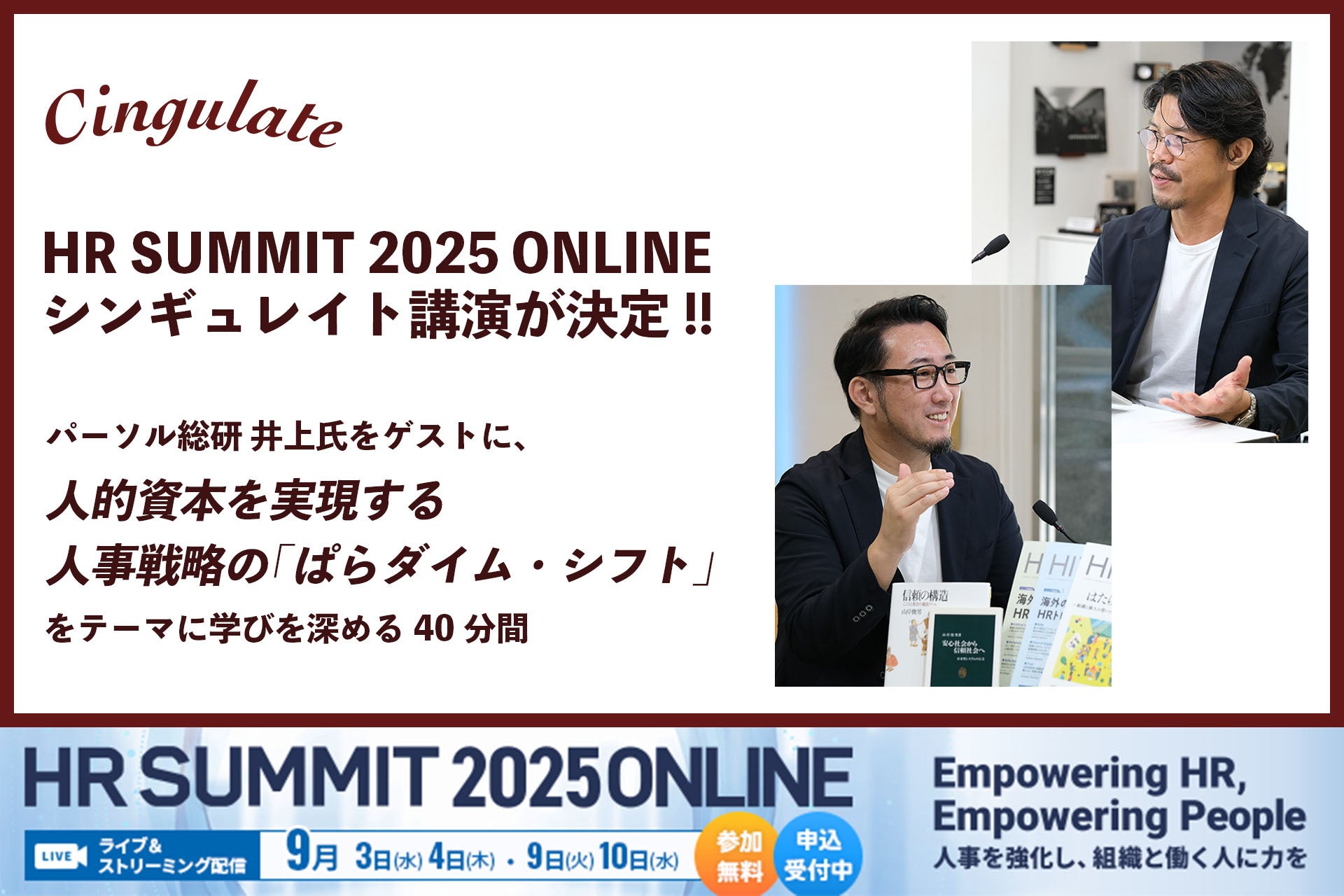 科学とデータの力で組織開発を支援する株式会社シンギュレイト(本社:東京都渋谷区、代表取締役:鹿内 学、以下シンギュレイト)は、ゲストに株式会社パーソル総合研究所(本社:東京都江東区、代表取締役社長:岩田 亮)の井上亮太郎氏をお招きし、『人的資本を実現する人事戦略の「ぱらダイム・シフト」』というテーマで、「HR SUMMIT 2025 ONLINE」にて講演することをお知らせいたします。講演日時は、2025年9月10日(水)15:40〜16:20です。