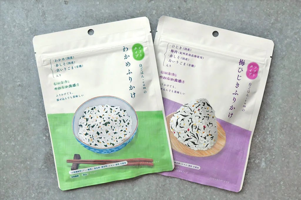 素材と調味料だけを混ぜ合わせた『ごはんふりかけ』『和風カレーふりかけ』、国産わかめと国産ひじきを使用した『わかめふりかけ』『梅ひじきふりかけ』など、4種類のラインナップ。
