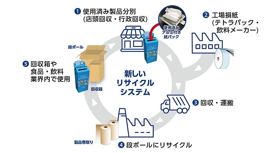 日本テトラパックと王子ホールディングスは、アルミ付き紙容器を段ボールへ再生する国内初のリサイクルシステムを構築し、今後の展開として食品業界などへの本格普及を目指しています。