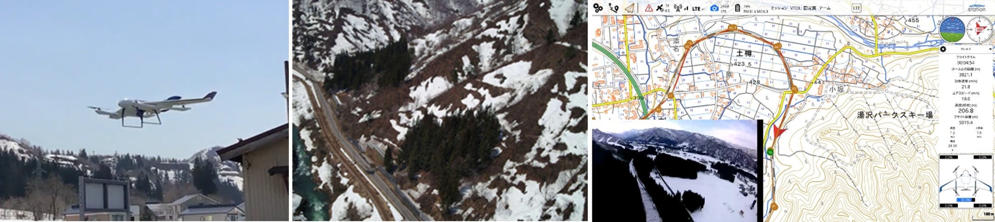 本試験で用いた機材は、VTOL型ドローンである国産ドローンのAS-VT01K(エアロセンス社製)で、機体は国土交通省の「第二種型式認証」を取得しており、目視外飛行にも申請不要となり、LTE通信による遠隔操作と、最大50kmの長距離の自動飛行が可能です。ドローンのペイロード(アイテム搭載スペース)には、固定カメラやジンバルカメラが搭載可能となっており、只見線ではジンバルカメラ、上越線では固定カメラを搭載して試験しました。また、フロントカメラの映像はリアルタイムで確認し調査を行いました。