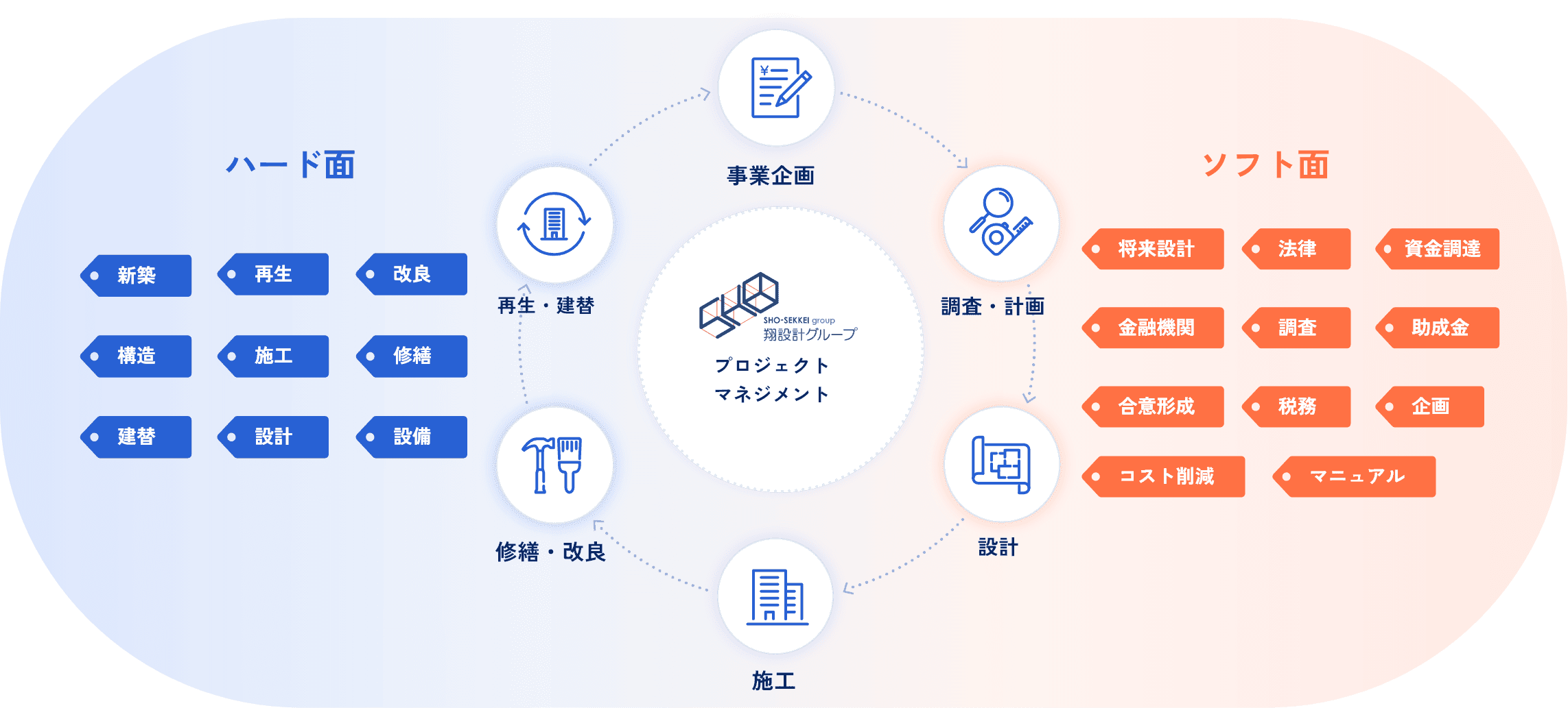 株式会社翔設計の建築士、不動産コンサルタント、コンストラクションマネージャーなどの専門家が、お客様の具体的な状況や要望を詳細にヒアリングし、事業計画の立案から設計、施工監理、完成後の維持管理に至るまで、最適なソリューションを提案します。