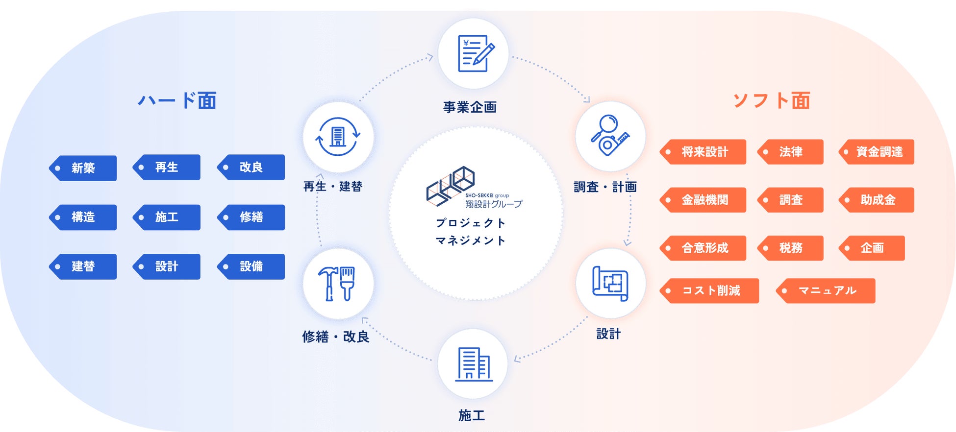 株式会社翔設計は、1985年の設立以来、建築設計・監理、コンストラクションマネジメント、不動産コンサルティングなど、建築に関する総合的なコンサルティングサービスを提供してまいりました。お客様の多様なニーズに応えるべく、専門性の高い技術と豊富な経験に基づいたサービスを通じて、安全で快適、かつ持続可能な社会空間の創造に貢献しています。私たちは、お客様の夢やビジョンを具体化し、社会に新たな価値を生み出すことを使命としています。