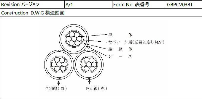 GBPは、これらの問題を解決し、電力ケーブル不足にお困りの事業者様のお力になれるよう、CVTケーブルの開発・生産・品質保証を経て、このたびCVTケーブルを販売することとなりました。現在は600V CVTケーブル38SQ,60SQ,100SQ,150SQ,200SQ,250SQ,325SQサイズを提供可能です。下記は、仕様書の一部です。