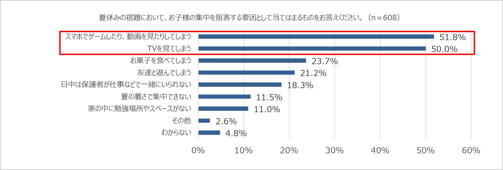 さらに、子どもの集中力を阻害する要因を聞いたところ、約半数が「スマホでゲームをしたり、動画を見たりしてしまう(51.8%)」「TVを見てしまう(50.0%)」と回答しました。