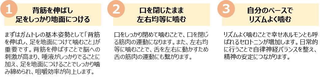 「ガムトレ」とはロッテ噛むこと研究部が監修する、ガムを使ったトレーニングです。「ガムトレ」の3つのポイントをおさえ、健康によいとされている「噛む」という行為をガムを使って日常的・継続的に実践しましょう!