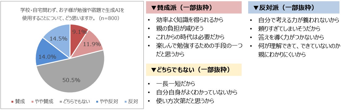 賛成派からは「効率よく知識を得られるから」、「親の負担が減りそう」とその利便性への期待や「今後使用する機会が必ずあるため、使えるようになることは必要だと思う」という時流に合わせて対応していくことの必要性を感じている声が挙がりました。反対派からは「自分で考える力が養われない」「AIに頼りすぎてしまう」などと成長を妨げてしまうものとして、不安視する声が多く見られました。どちらでもない派からは、「一長一短で判断がつかない」という声が多く、また、「自分自身がよくわかっていないから」と生成AIへの理解が十分にできていない親も一定数見られました。