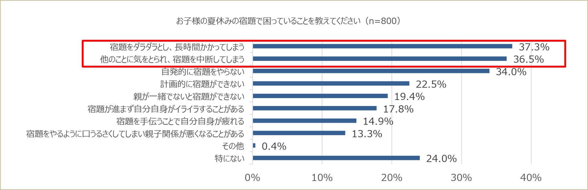 66.1%の親が宿題を手伝ったことがあると回答する中、子どもの夏休みの宿題を手伝ったことがある親に、困っていることを聞いたところ、「宿題をダラダラとし、長く時間がかかってしまう(37.3%)」、「他のことに気をとられ、宿題を中断してしまう(36.5%)」など、子どもの集中力が続かないことが原因の一つとして考えられる悩みが上位に上がりました。また、「宿題が進まず、自分自身がイライラすることがある(17.8%)」と回答する人がいるなど、夏休みの宿題が親の負担になっている様子も伺えました。