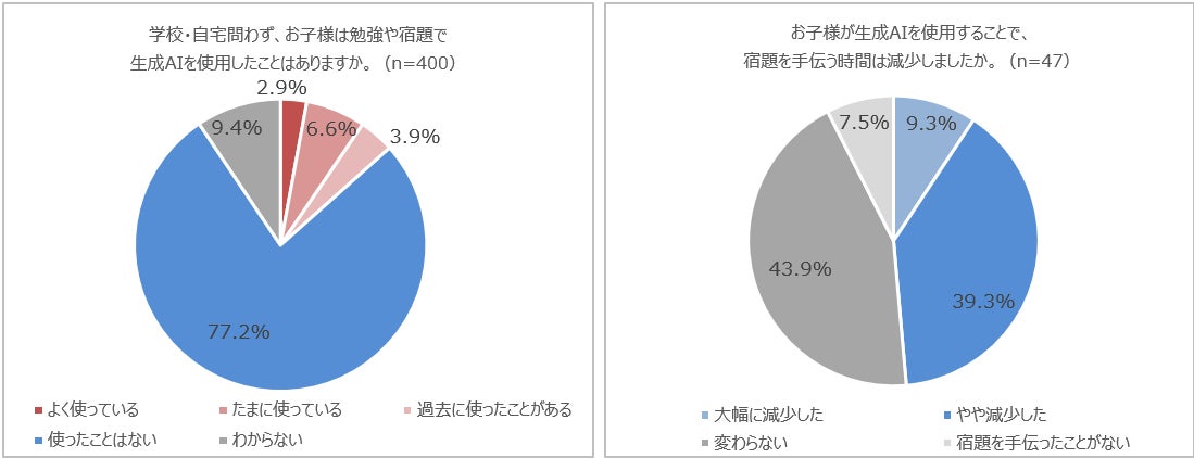 小学生のAI活用の実態を明らかにするため、子どもの生成AIの使用経験について聞いたところ、77.2%が「使ったことがない」と回答、「使ったことがある(13.4%)」と回答した人は10人に1人という結果になり、現状、小学生の間ではほとんど活用されていないことが分かりました。「使ったことがある」と答えた人のうち、半数近くの親が「親の手伝う時間が減少した」と回答しており、生成AIの活用賛成派に「親の負担が減りそう」というコメントが見られたように、実際に生成AIの活用により、親の負担軽減を実感している人がいることわかりました。