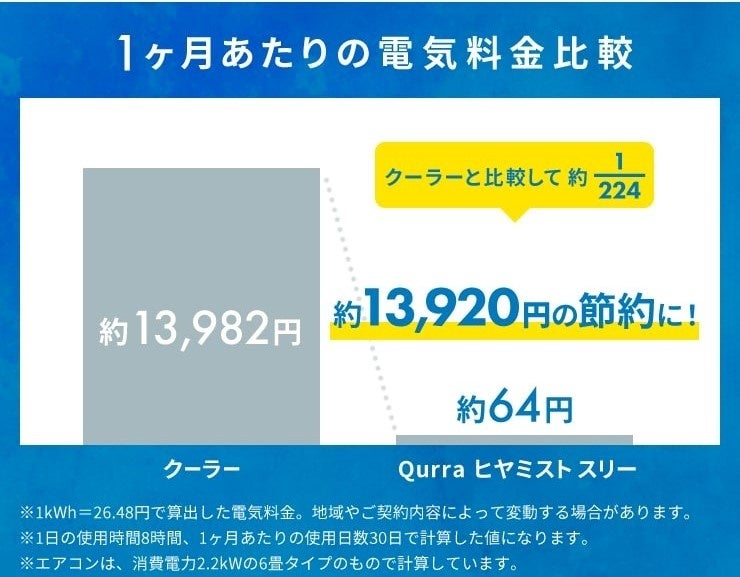 「ヒヤミスト3」は消費電力が圧倒的に少なく、1日8時間で1ヶ月使用しても電気代はわずか約64円。クーラーを使用する場合に比べて、約13,920円も節約することができます。今年は電気代が高騰していますが、「ヒヤミスト3」なら電気代が安いのでためらわずに使うことができるため、暑さ対策に重宝する商品です。