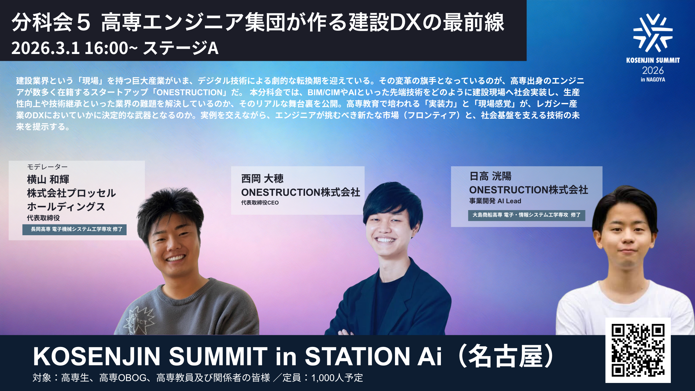 伝統ある巨大産業である建設業界がいま、デジタル技術による劇的な転換期を迎えている。その変革の旗手となっているのが、高専出身のエンジニアが数多く在籍するスタートアップ「ONESTRUCTION」だ。 本分科会では、AIやデジタルツインといった先端技術をどのように建設現場へ社会実装し、生産性向上や技術継承といった業界の難題を解決しているのか、そのリアルな舞台裏を公開。高専教育で培われる「実装力」と「現場感覚」が、レガシー産業のDXにおいていかに決定的な武器となるのか。実例を交えながら、高専エンジニア集団が挑む最前線と、社会基盤を支える技術の未来を提示する。