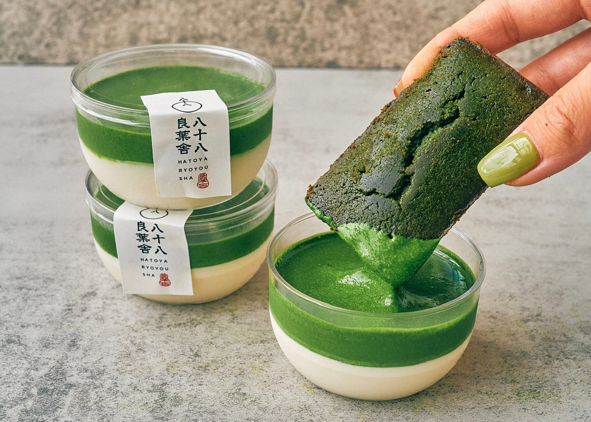 八十八良葉舎の開店当初から人気の「八十八プリン」。あっさりとした甘さのミルクプリンと濃密な“自家製抹茶餡”のバランスが調和した一品です。抹茶本来の旨味と苦味をお愉しみいただけます。