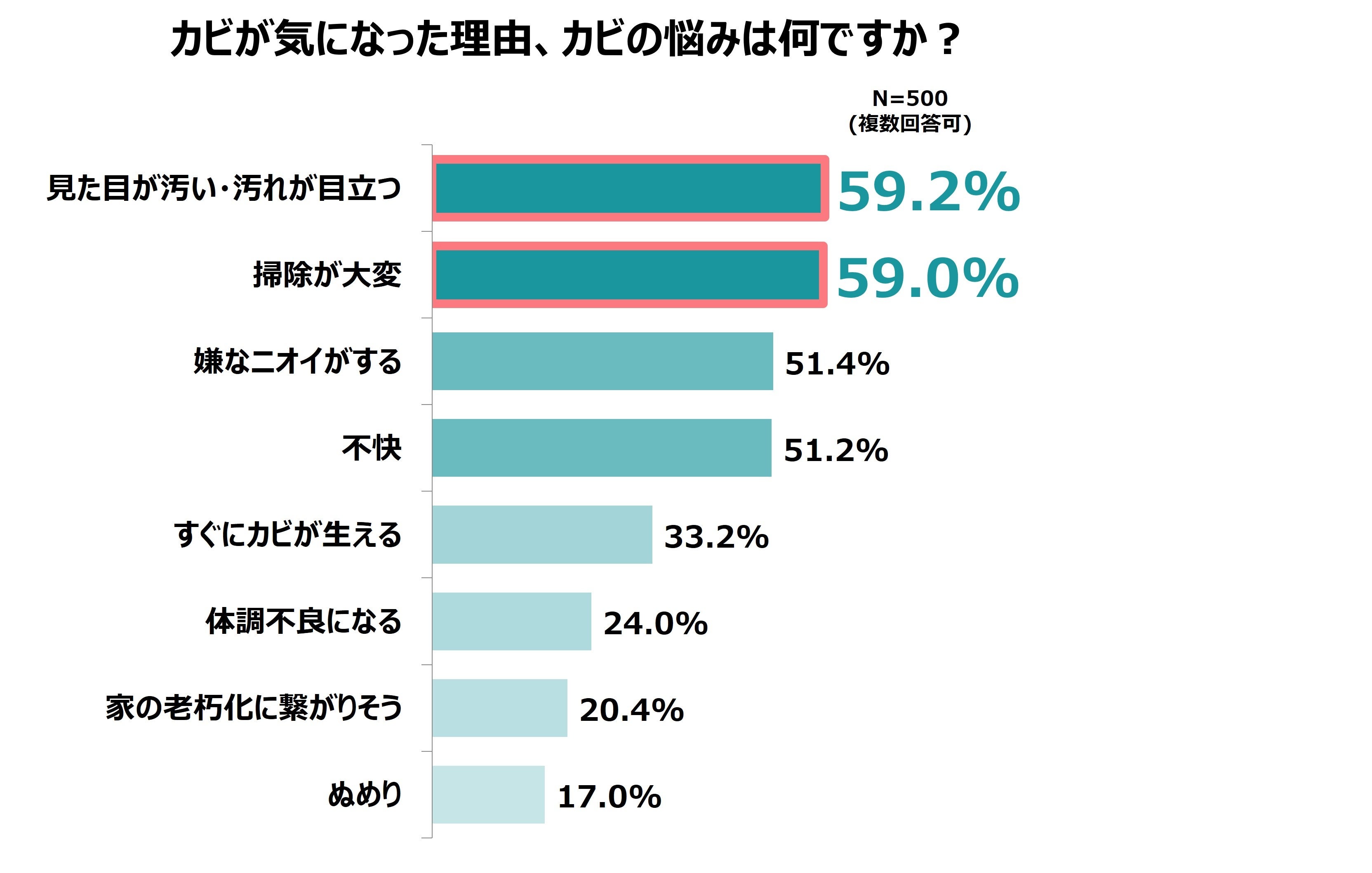 また、「カビが気になった理由、カビの悩み」を尋ねたところ「見た目が汚い・汚れが目立つ」(59.2%)と「掃除が大変」(59.0%)が約6割という結果となりました。