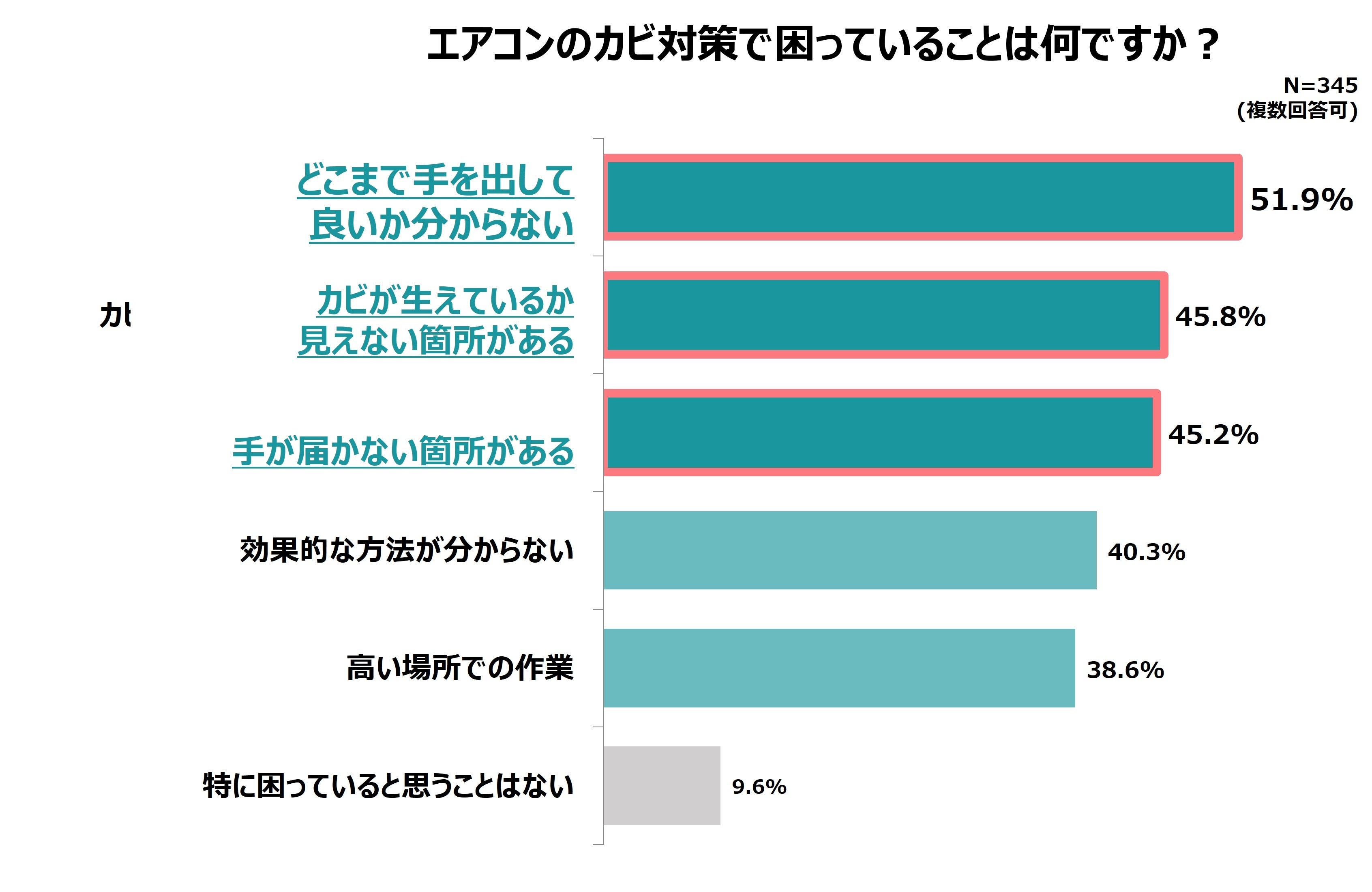 さらに、「エアコンのカビ対策で困っていること」について尋ねたところ、「どこまで手を出して良いか分からない」と回答した人が最も多く、約5割(51.9%)にのぼりました。他にも「カビが生えているか見えない箇所がある」(45.8%)、「手が届かない箇所がある」(45.2%)が続く結果となりました。