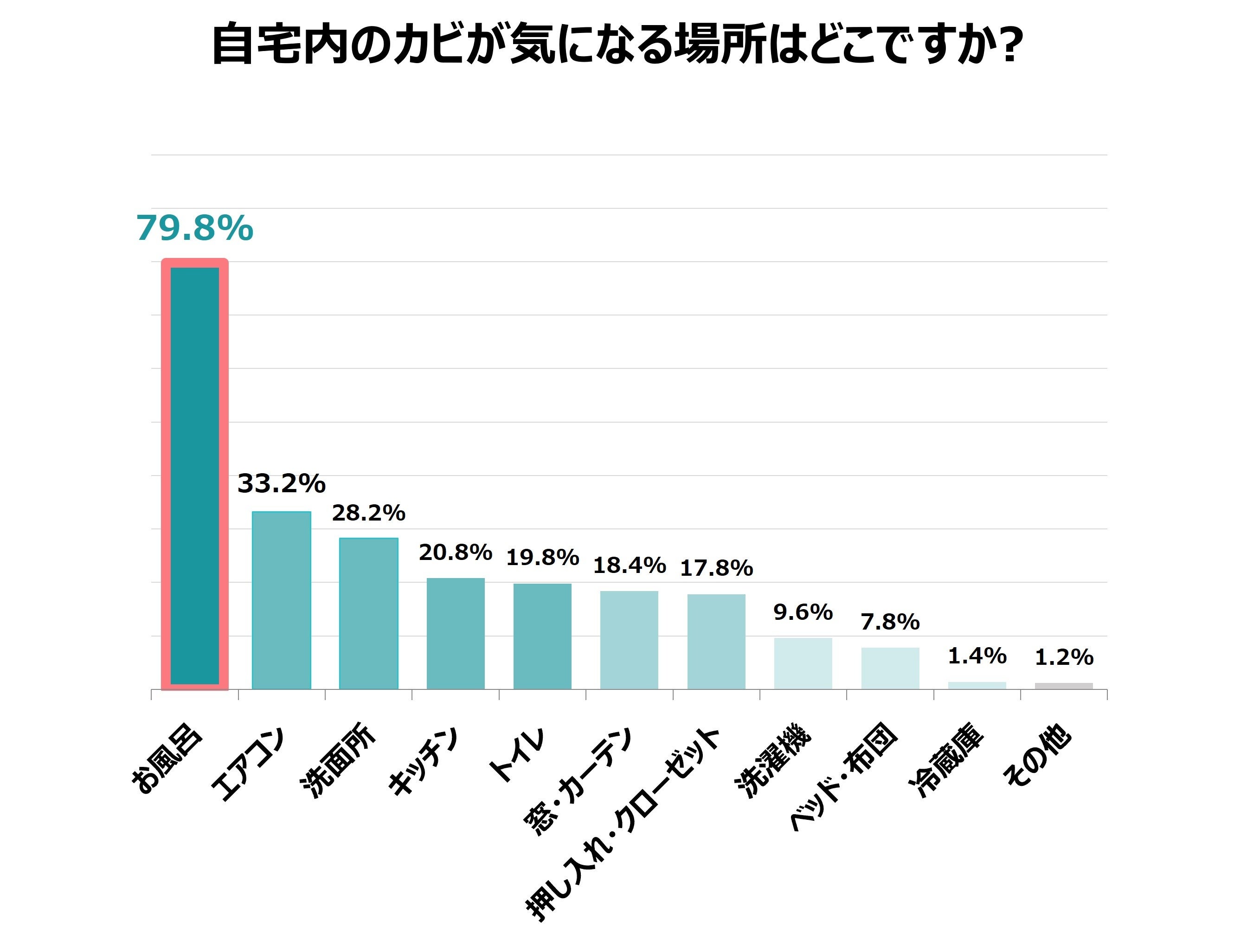 「自宅のカビが気になる場所」を尋ねたところ、「お風呂」が圧倒的に多く、約8割(79.8%)、次いで「エアコン」が約3割(33.2%)という結果になりました。その他TOP5には「洗面所」「キッチン」「トイレ」と水回りが続き、エアコンは家電製品で唯一ランクインしています。