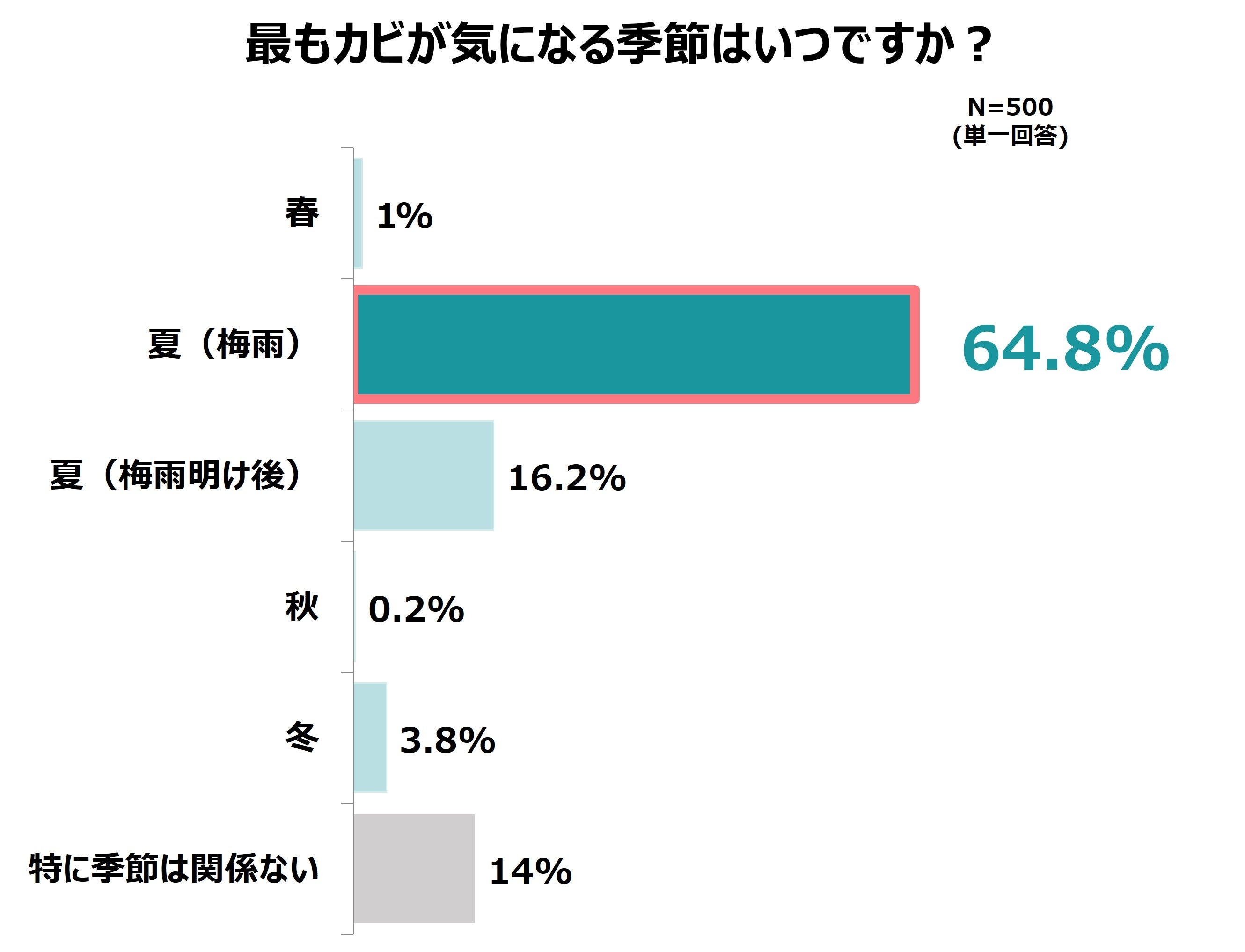「最もカビが気になる季節」を尋ねたところ、6割以上(64.8%)の人が「夏(梅雨)」と回答し、温度・湿度が高まるこれからの時期に、カビに対する不安が最も高まることが明らかになりました。