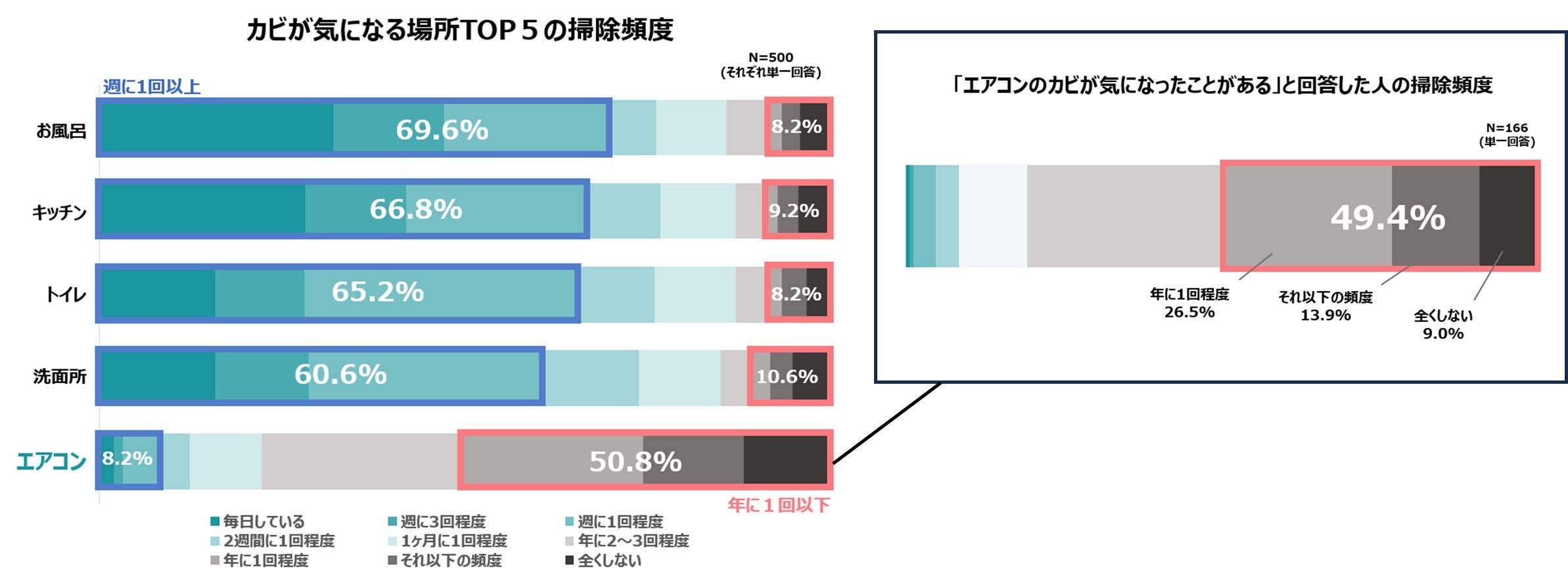 水回りは「週に1回以上」が約6割に対して、エアコンは「年に1回以下」が約5割という結果に