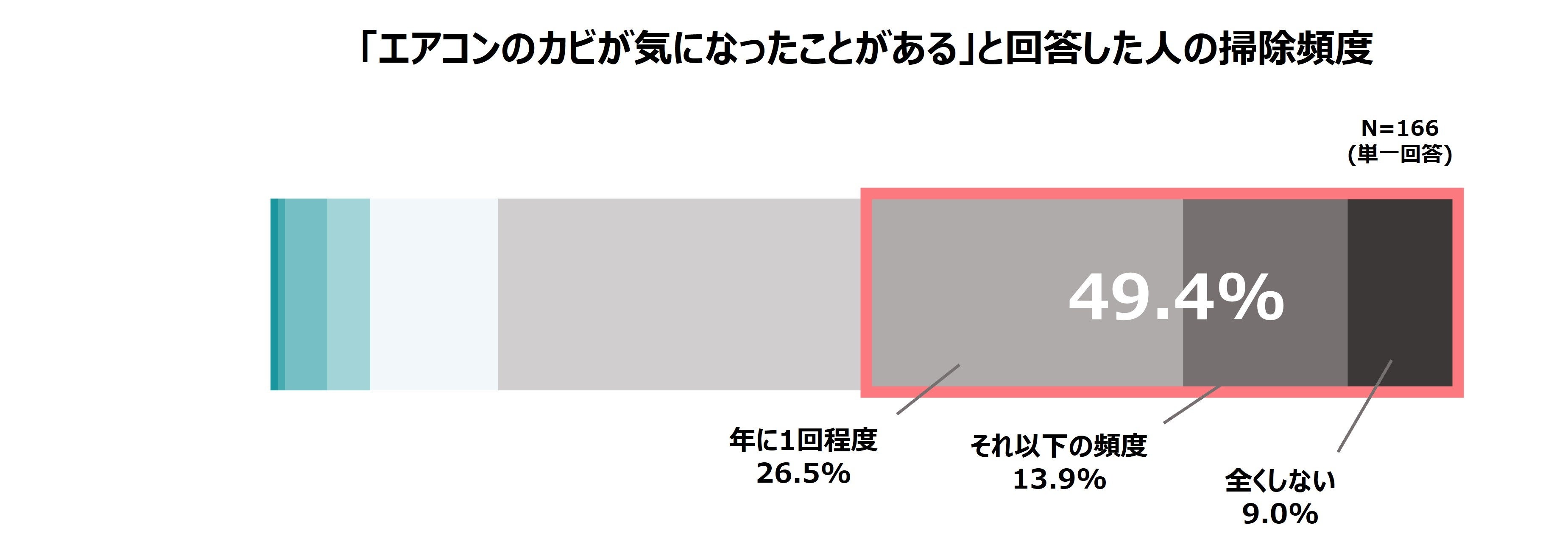 また、「エアコンのカビが気になったことがある」と回答した人でも、約5割(49.4%)が掃除頻度は「年に1回以下」と回答しています。エアコンはカビが気になってもほとんど掃除をしない“見て見ぬふり家電”であることが浮き彫りとなりました。