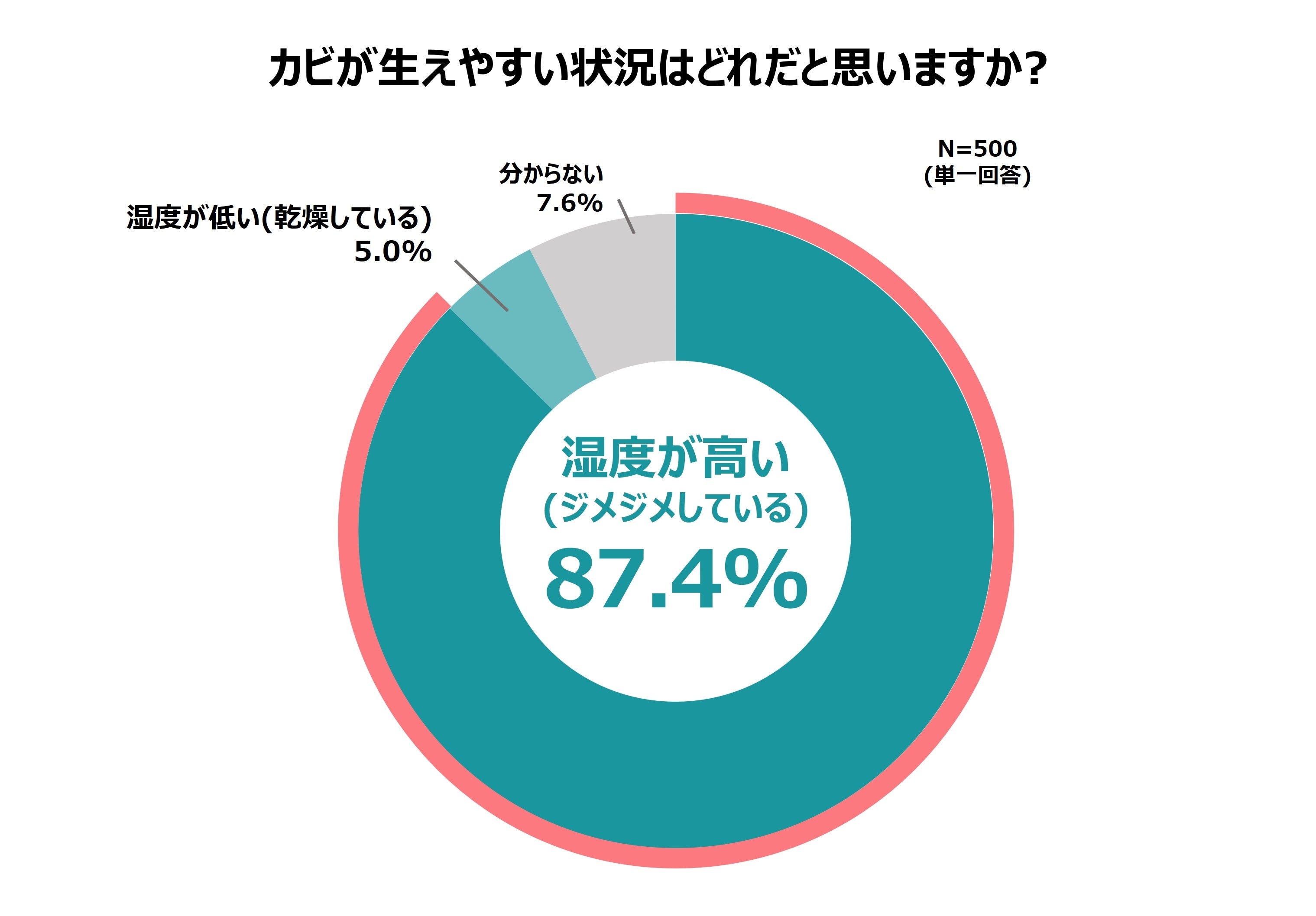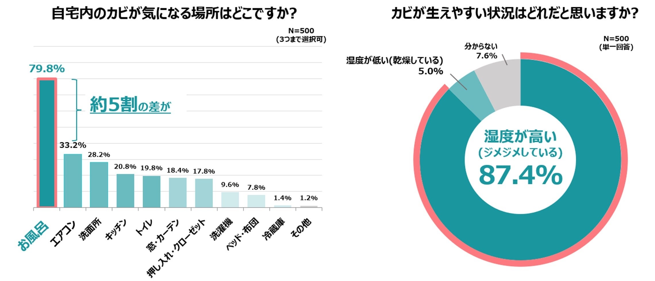 一方、お風呂とエアコンでは結果に約5割の差があります。「カビがどのような状況で生えやすいと思うか」という設問に対して約9割(87.4%)が「湿度が高い(ジメジメしている)」と回答していることから、「湿度が高いとカビが生えやすい」というイメージが浸透していることがうかがえます。お風呂は多くの人が日常的に使用するエリアであり、実際にカビを目にしたり、湿度が高いことを体感していることから、エアコンと大差がついたと推測されます。