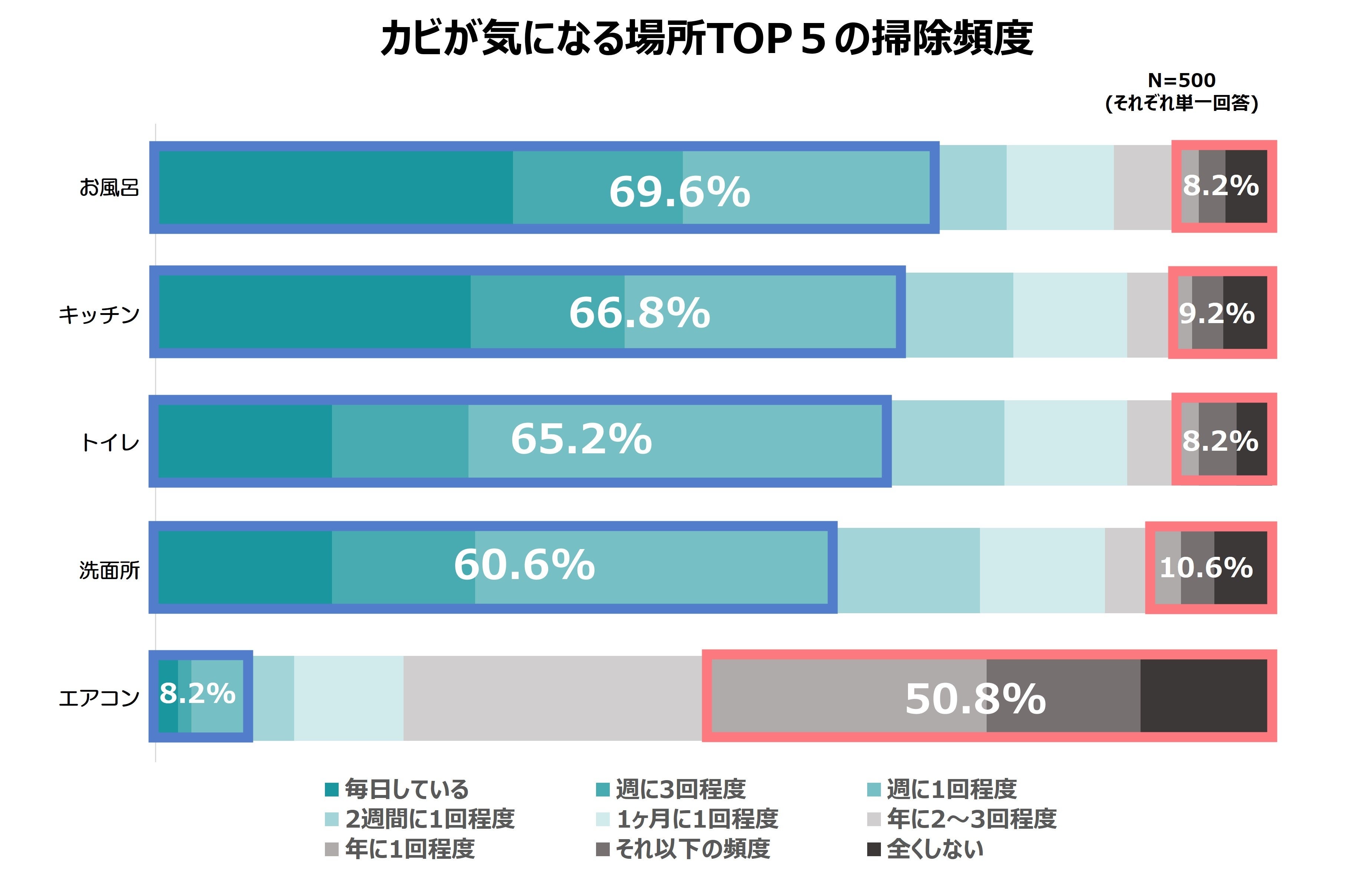 「カビが気になる場所」TOP5の「お風呂」「エアコン」「洗面所」「キッチン」「トイレ」について、それぞれの掃除頻度を比較したところ、エアコン以外の水回り4箇所は「週に1回程度」が約6割以上という結果になりました。対してエアコンは、約5割(50.8%)が「年に1回以下」と、最も掃除頻度が少ないことが分かりました。