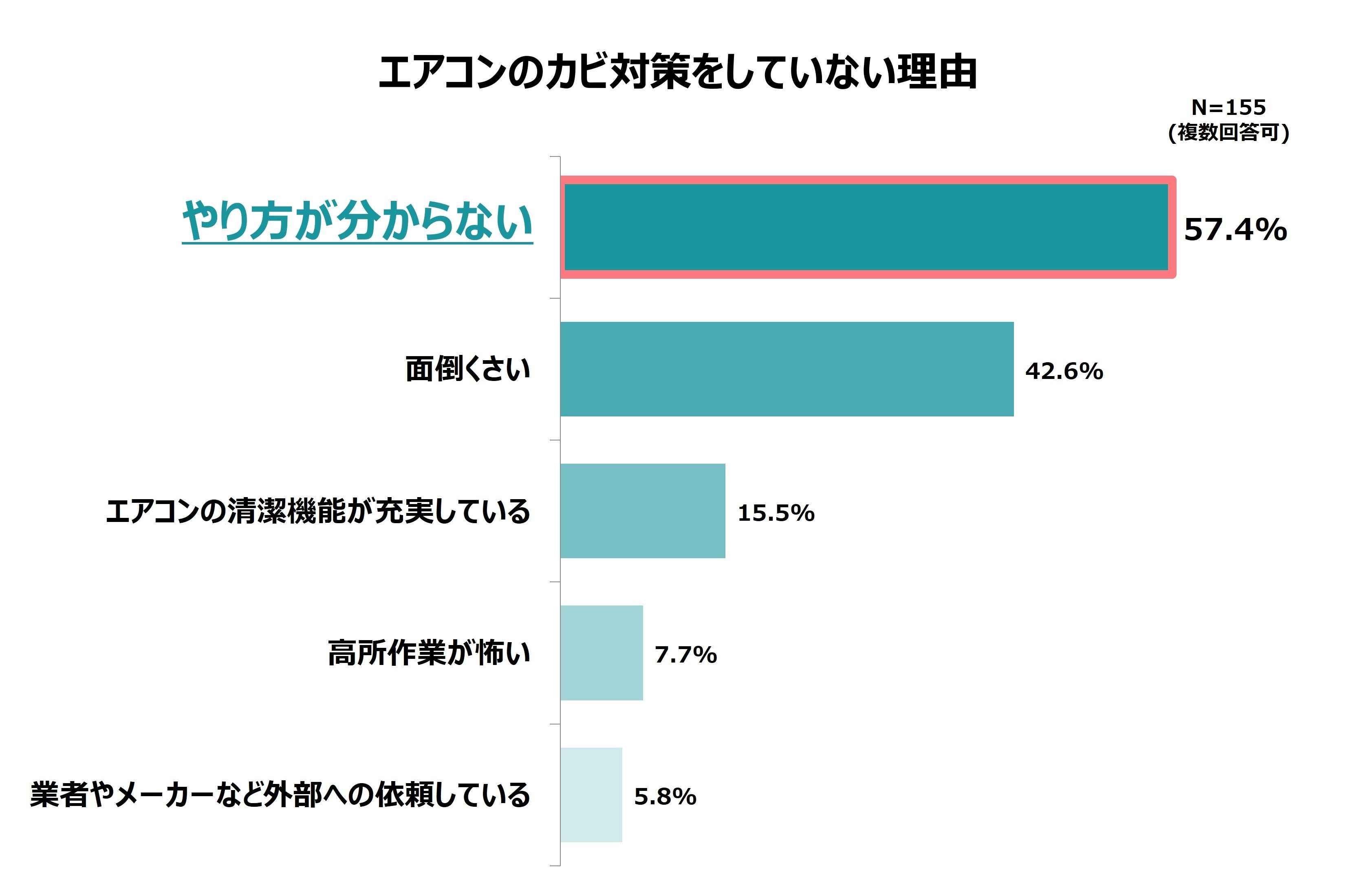 カビ対策をしていない理由では「やり方が分からない」が最も多く、約6割(57.4%)となっていることから、エアコンの複雑な構造によるお手入れの煩わしさから、エアコンが“見て見ぬふり家電”となっていることが推測されます。