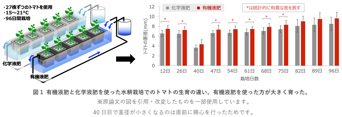 われわれは、有機液肥と化学液肥を使い、それぞれ27株のトマトの水耕栽培を96日のあいだ行いました。栄養成分としての硝酸イオン濃度は、両液肥で同じとなるように調整されています。図1は、植物体の茎の太さを計測した結果です。有機液肥を使用した場合、化学液肥と比べて植物体が10%程度大きくなりました。また、トマト果実も化学液肥を使用した場合と同等量が収穫できました。