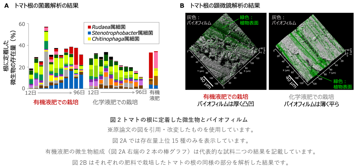 化学液肥と比べて、有機液肥を使うとトマトの根に定着する微生物に違いが生ずるのかを菌叢解析によって調べました(図2A)。その結果、使用した有機液肥自体に複数の微生物が含まれ、それらのうちの3種(Rudaea属細菌、Stenotrophobacter属細菌、Chitinophaga属細菌)が比較的高い割合で根に定着していました(図2A中のそれぞれ赤・青・黄色で示した微生物)。顕微鏡解析を行ったところ、有機液肥で栽培したトマトの根には、化学液肥のそれと比較して多量のバイオフィルムが形成されていることがわかりました(図2B)。