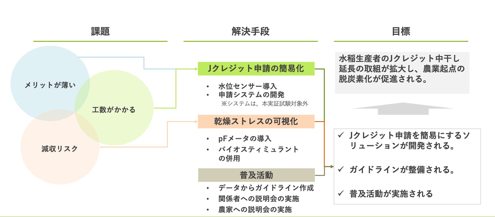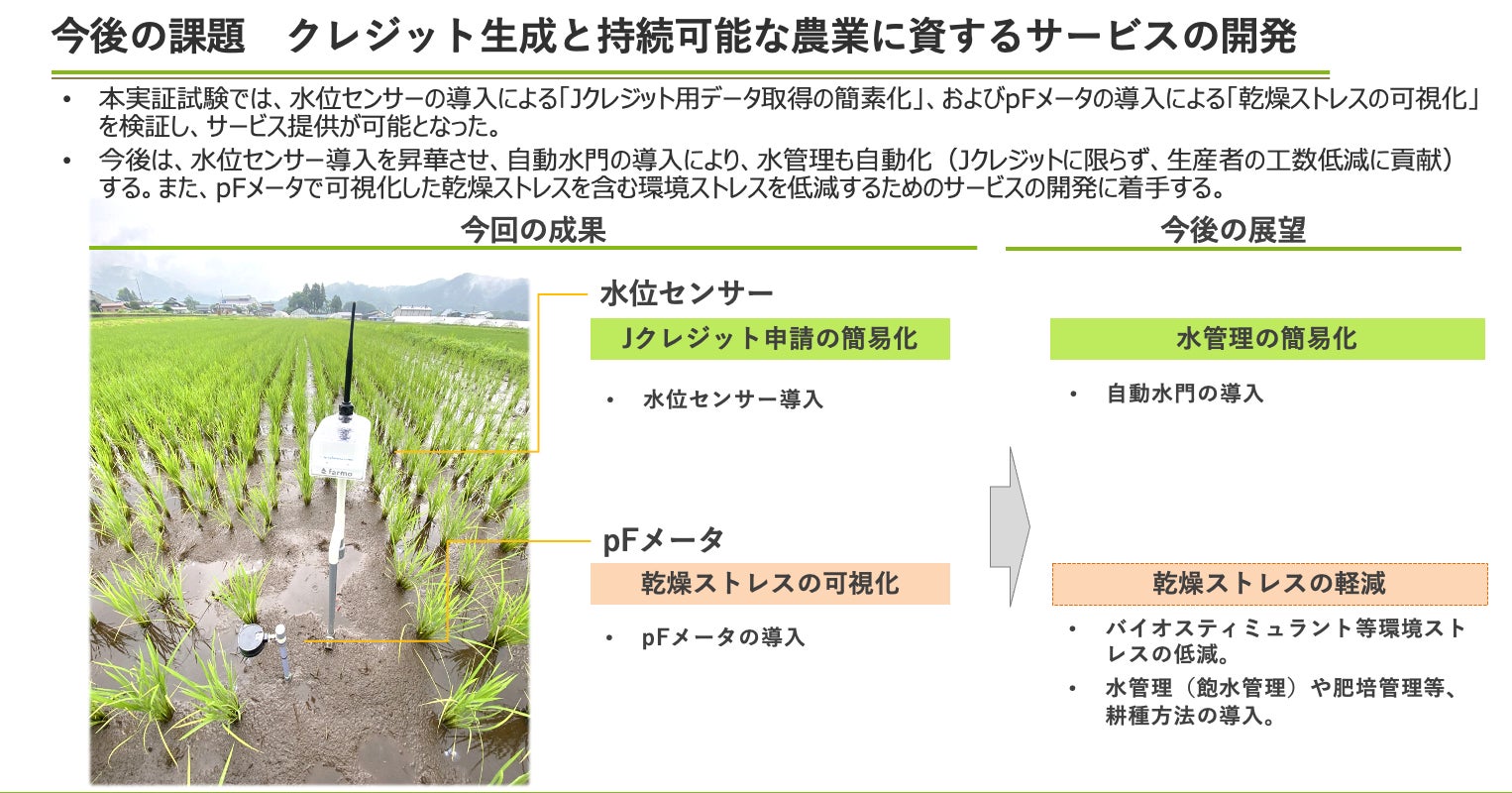 本実証を通し、①水位センサーの導入により、J-クレジット水田中干し延長の圃場データ取得の作業工数を軽減することが可能であること、②水田中干し延長による乾燥ストレスを可視化するツールの検証を行い、活用可能であることを確認しました。