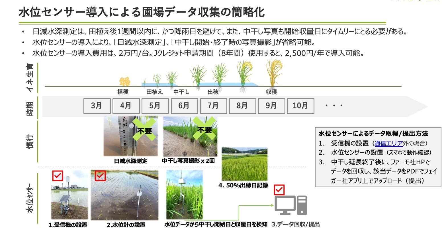 「Jクレジットは、営農における環境配慮のツールの一つであるが、水位センサーの導入により、圃場におけるデータ収集の作業工数が下げられるのはありがたい。」