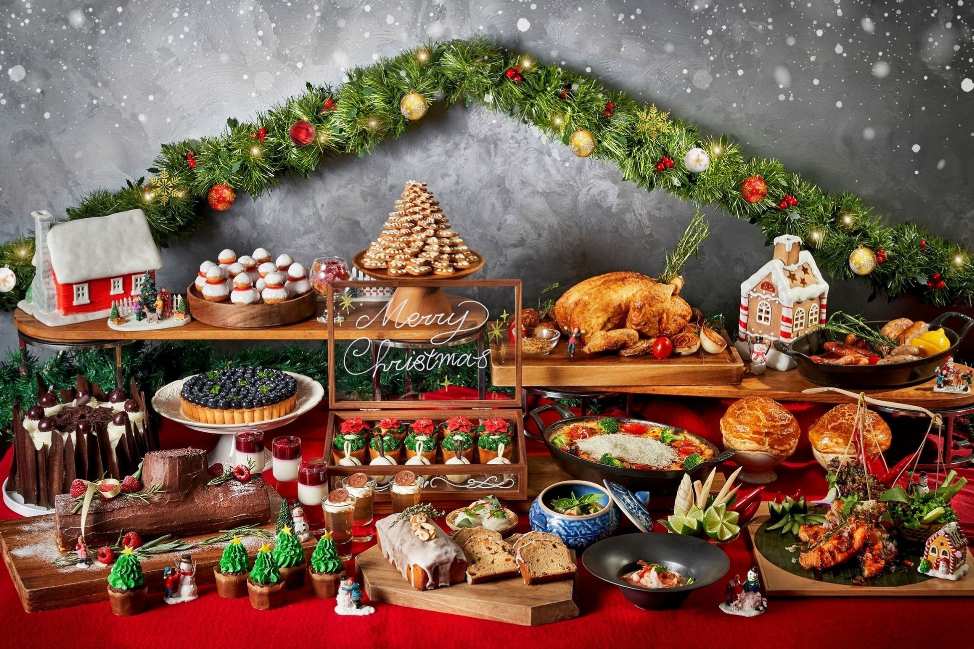 ブッシュドノエルやクリスマスカップケーキなどキュートなスイーツがビュッフェ台を華やかに演出