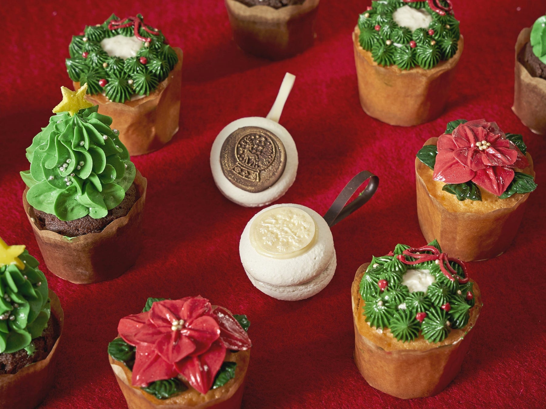 充実のスイーツメニューを取り揃え、ランチメインとしても、またスイーツメインとしてもお楽しみいただける今回のビュッフェでは、大人の味わいのビターチョコレートクリームをふわふわのスポンジで巻き、木の切り株のように見立てたクリスマスの定番ケーキ「ブッシュドノエル」や、バタークリームでツリーやクリスマスリース、ポインセチアの花を作りデコレーションした可愛らしい「クリスマスカップケーキ」、ホワイトチョコレートやミックスフルーツのガナッシュをしのばせ、クリスマスオーナメントのように仕上げた「オーナメントマカロン」など、クリスマス気分を盛り上げるキュートなスイーツの数々がお目見えします。