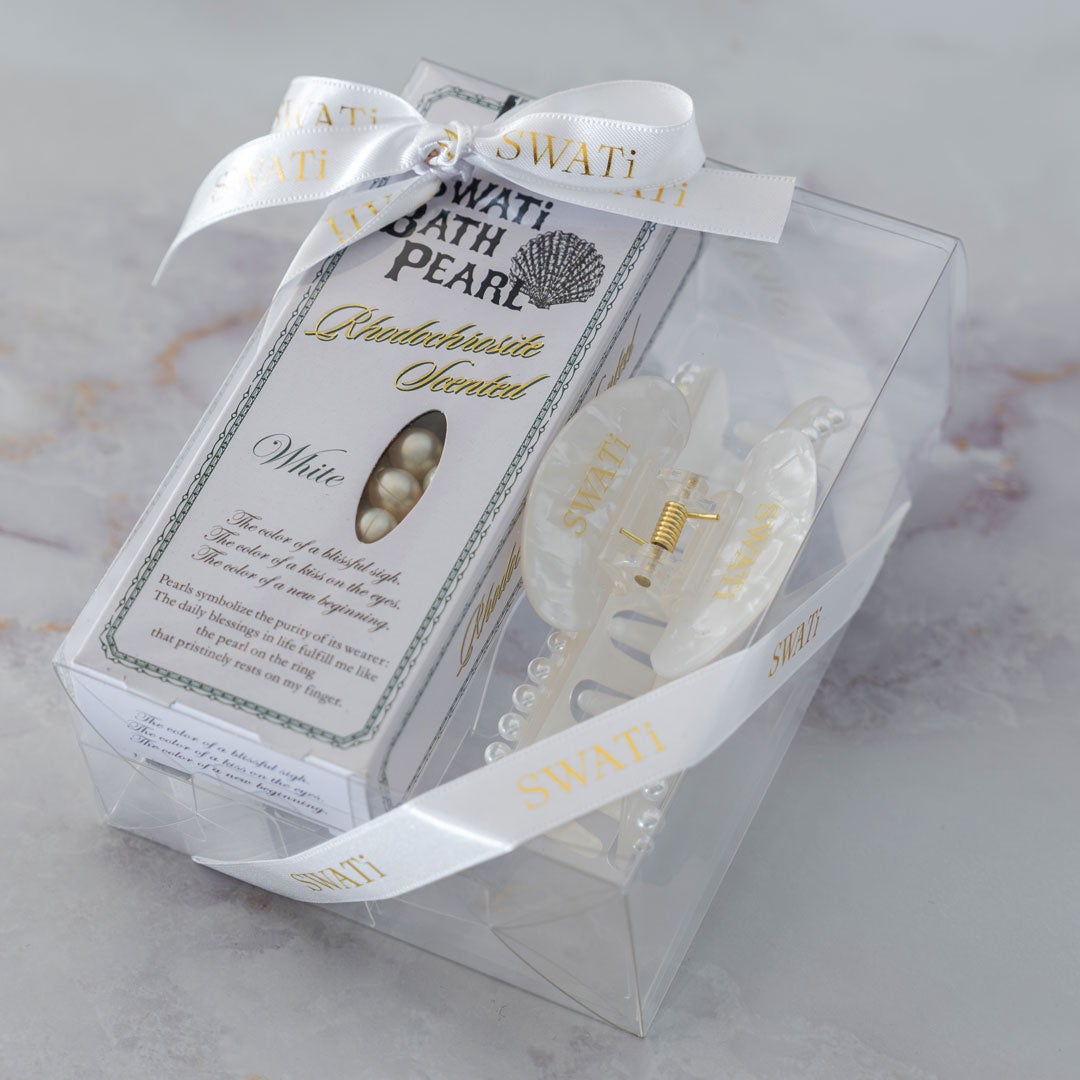 SWATiの代名詞!SNSで大人気のパールモチーフの入浴料と、ブランドディレクターが細部までこだわった「オリジナルへアバンスクリップ」をリボン付きのBOXに!
