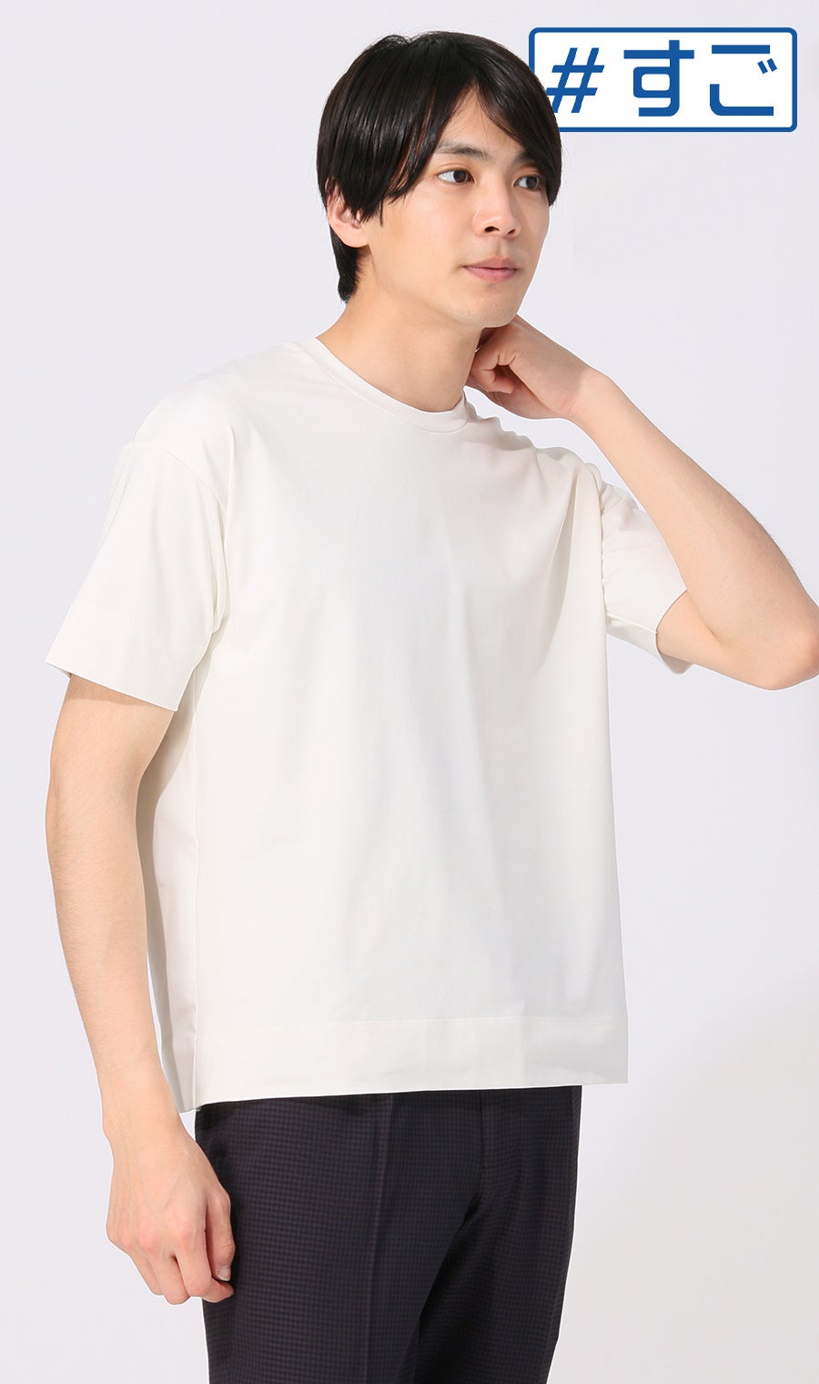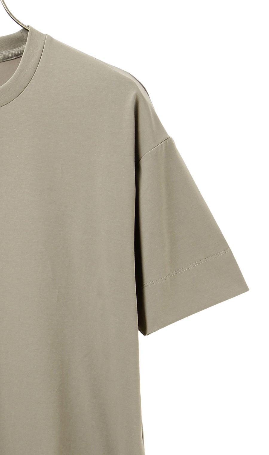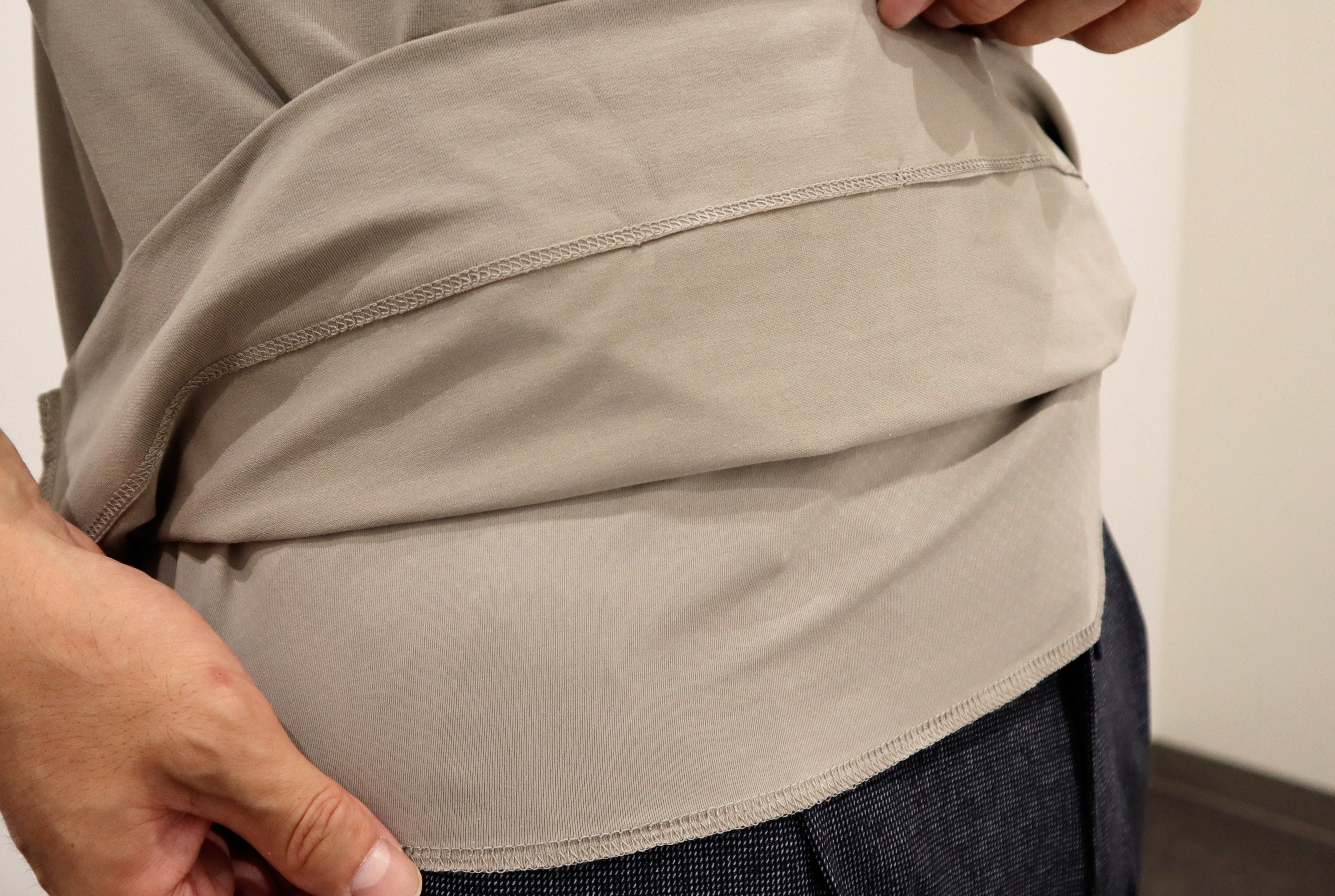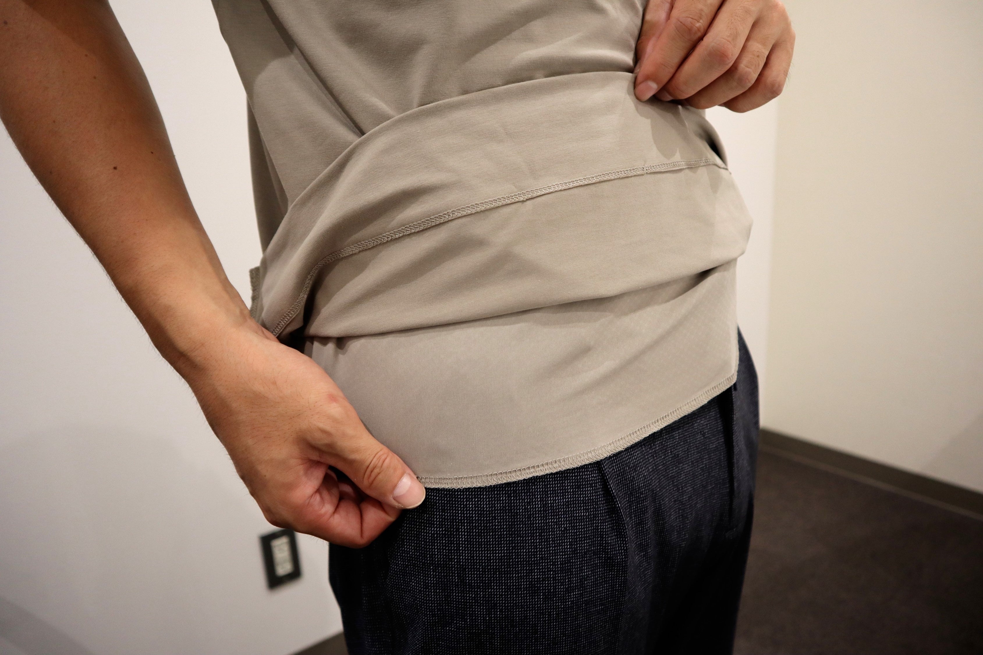 その他デザインにおいては、Tシャツのネック部分の襟を高く設計し、ジャケットの襟を汚れにくくしています。さらに、袖の裾部分を少し絞ることでジャケットの袖通しを良くする工夫を施すなど、ビジネス用として仕立てたTシャツです。