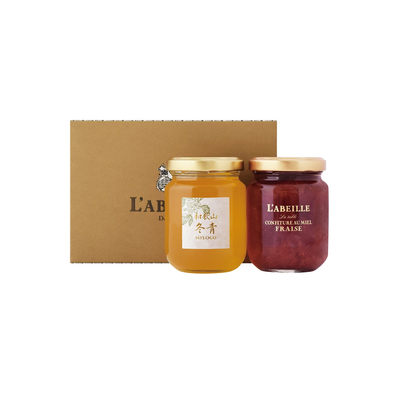■商品説明:縁起がよいと言われる冬青(そよご)のはちみつといちごのコンフィチュールのセット。紅白の色合いも新年のお祝いにぴったりです。お年賀ギフトにおすすめです。