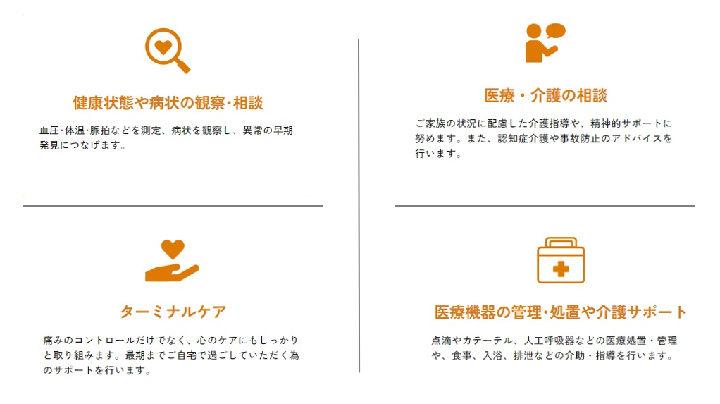 クオルドの訪問看護ステーション事業では、ご家族と一緒に利用者様の生活をサポートします。病気やけがでご自宅での医療的なケアを必要とする方を対象に、ご自宅に看護師が伺い、提携医療機関からの指示により、介護の補助や医療的なケアを行います。