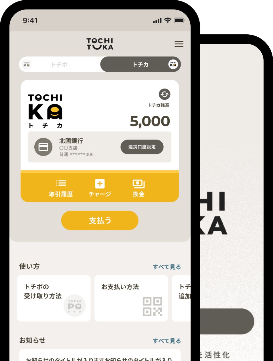 トチツーカのアプリでは、自治体が発行するポイント「トチポ」に加えて、北國銀行が発行する日本初の預金型ステーブルコイン「トチカ」の2種類の地域通貨の利用が可能となります。