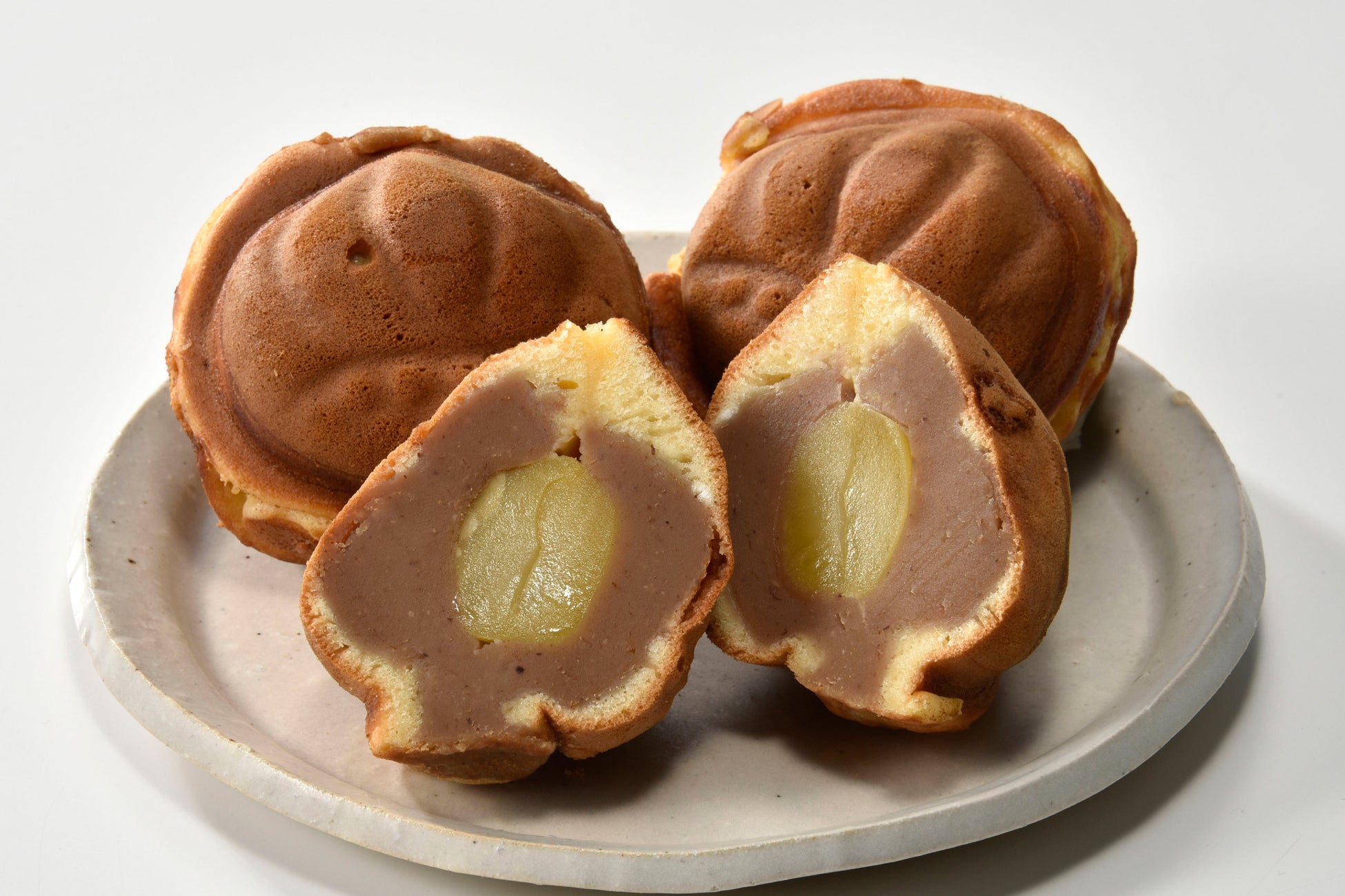 ふんわりしたカステラ生地に栗だけで作った濃厚な餡に、1粒栗を入れました。