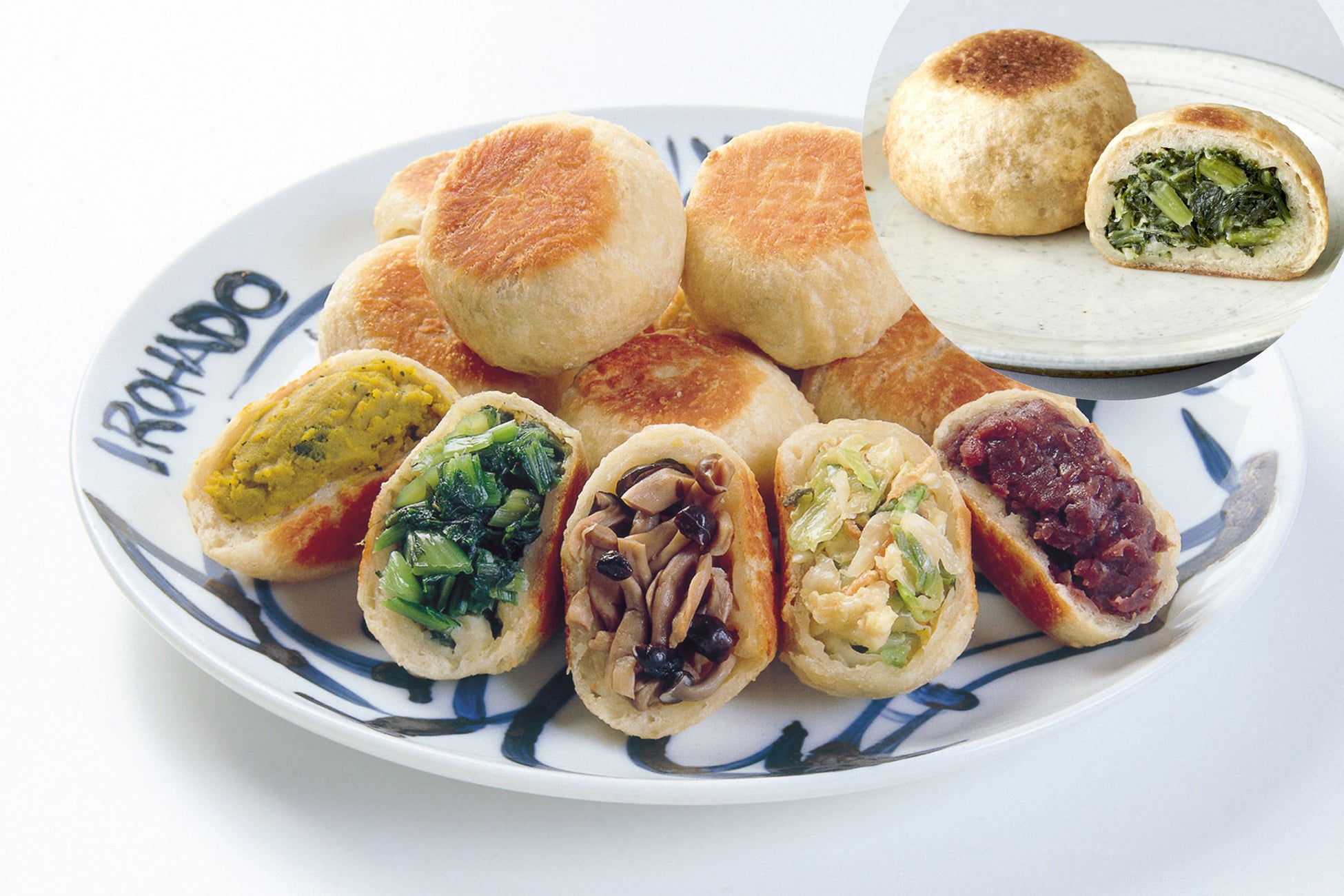 ①炉ばたのおやき各種(かぼちゃ・野沢菜・ぶなしめじ・野菜ミックス・粒あん・ねぎみそ・切干大根、1個)270円