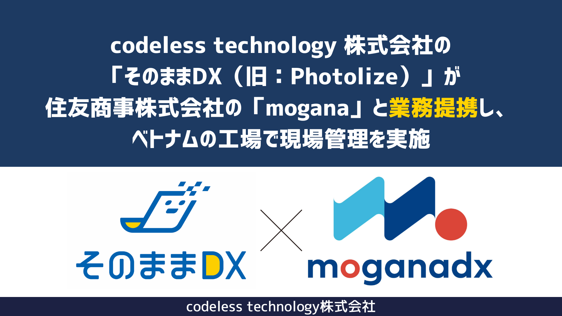 codeless technology 株式会社(以下「codeless technology」)は、住友商事株式会社(以下「住友商事」)が展開するデジタルトランスフォーメーション(DX)サービス「moganadx」と業務提携し、ベトナムの工場現場でのデータ管理と業務効率化を共同で進めることを発表いたします。この提携により、codeless technologyの「そのままDX(旧:Photolize)」を活用し、工場の業務データの入力を簡素化し、そのデータをmoganadxに連携させて、データの管理や分析の一元化を目指していきます。