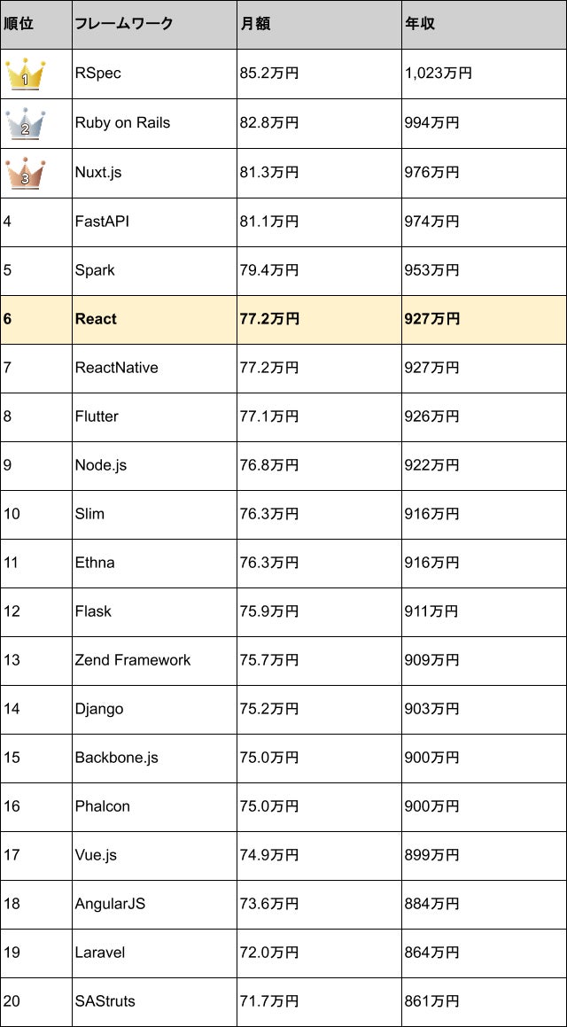 本調査では平均年収927万円でフレームワーク別6位、案件比率10.89%で1位と、報酬と案件数の両面で際立っています。
